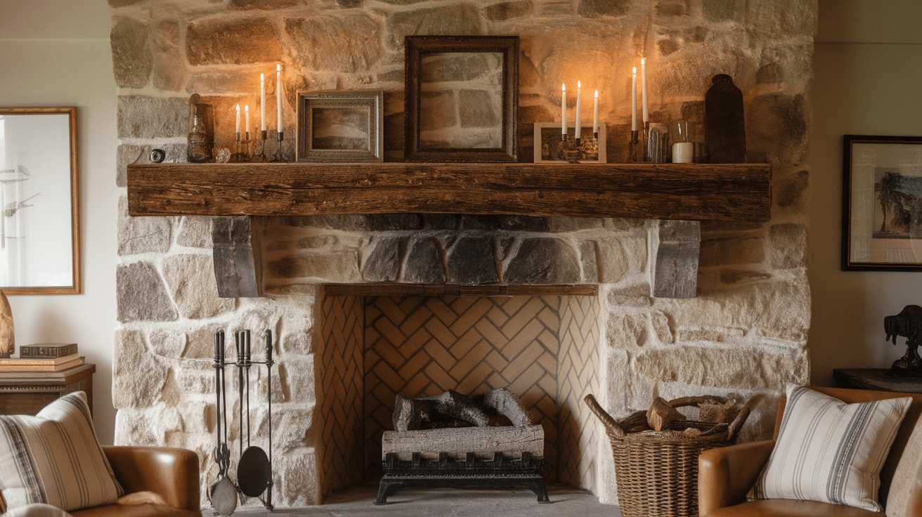 Stone fireplaces, brick accent walls, and black iron fixtures all add to the style.
