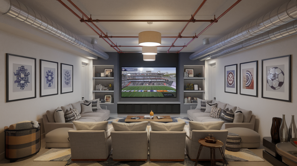Design your basement as a sports fan’s dream. Add a big screen, memorabilia, and comfortable seating to enjoy game days with friends and family. This style keeps the focus on fun, comfort, and entertainment.