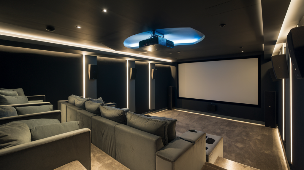 For seating, opt for comfortable, theater-style seating that fits the room’s layout and provides comfort for movie marathons.