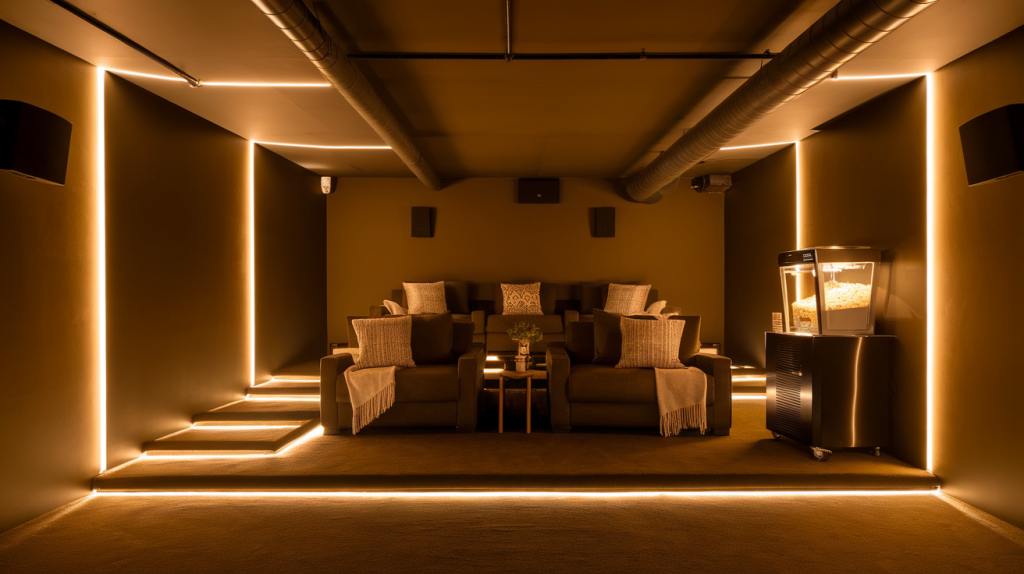 Install dimmable lighting or LED strips around the room to enhance the theater feel without being too bright. Decorate with movie posters or dark-colored wall paint to keep the space cozy.