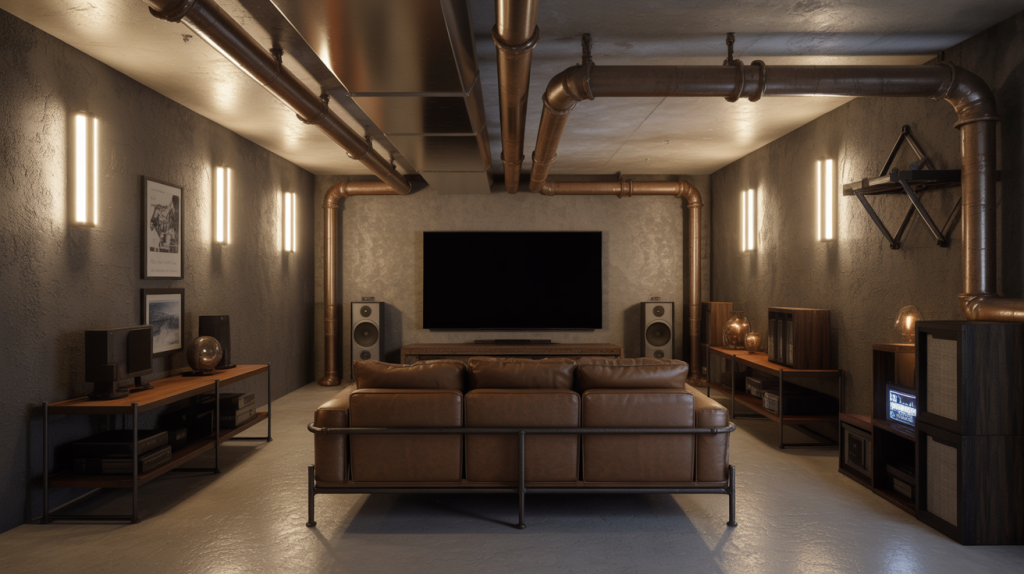 Appreciate the unfinished look of a basement with industrial decor. Exposed pipes, metal furniture, and a mix of concrete and wood textures give the space an edgy, modern feel, perfect for a home theater.