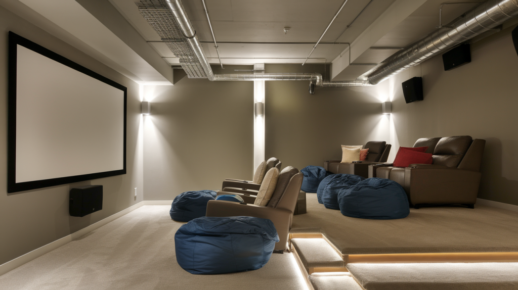 In smaller basements, create a cozy corner theater with wall-mounted equipment and flexible, space-saving seating. Bean bags or compact recliners can help maximize space while maintaining comfort and functionality.