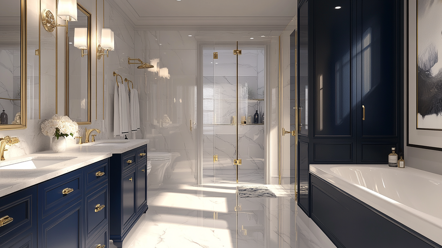 Navy blue adds a rich, deep color to your bathroom. It pairs well with white walls and gold or brass handles. Navy isn’t as common as white or gray, so it helps your bathroom stand out.