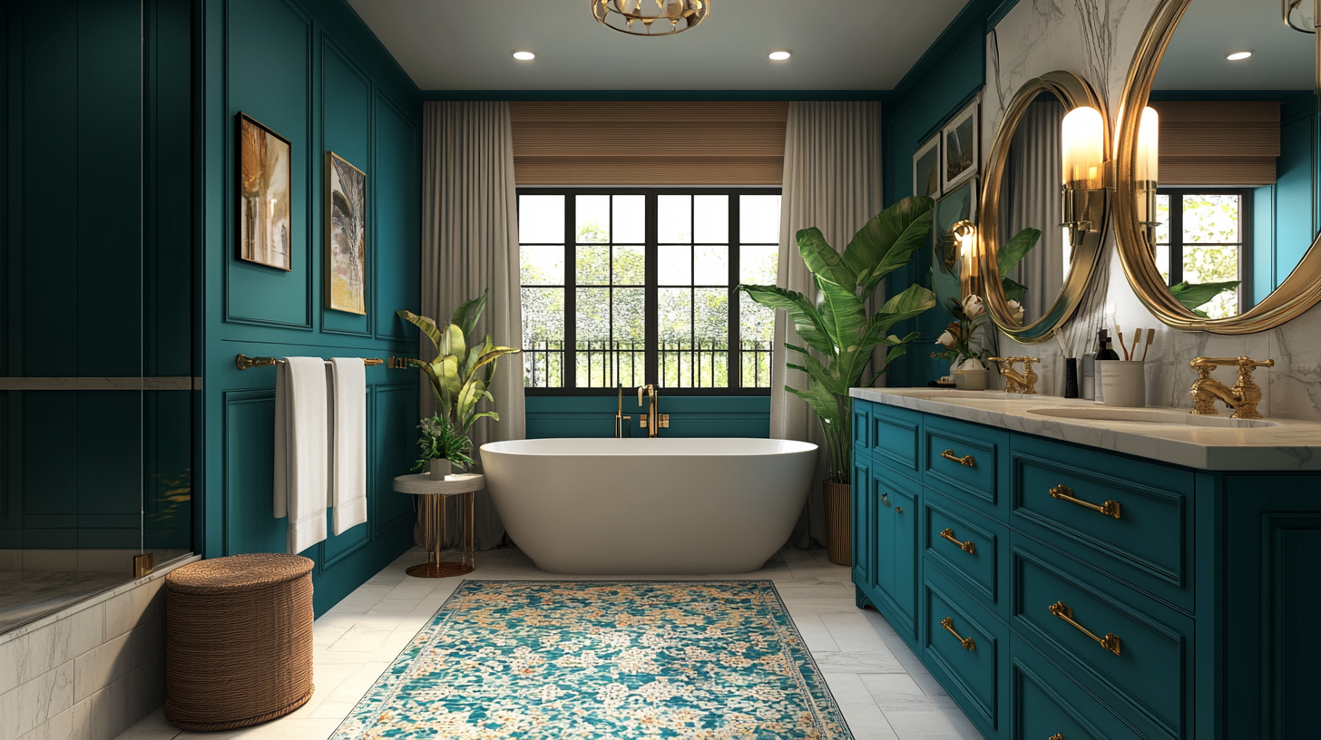 Teal cabinets hide water spots and small marks well, making them practical for busy bathrooms. This color choice shows confidence and creates a bathroom that guests will remember.