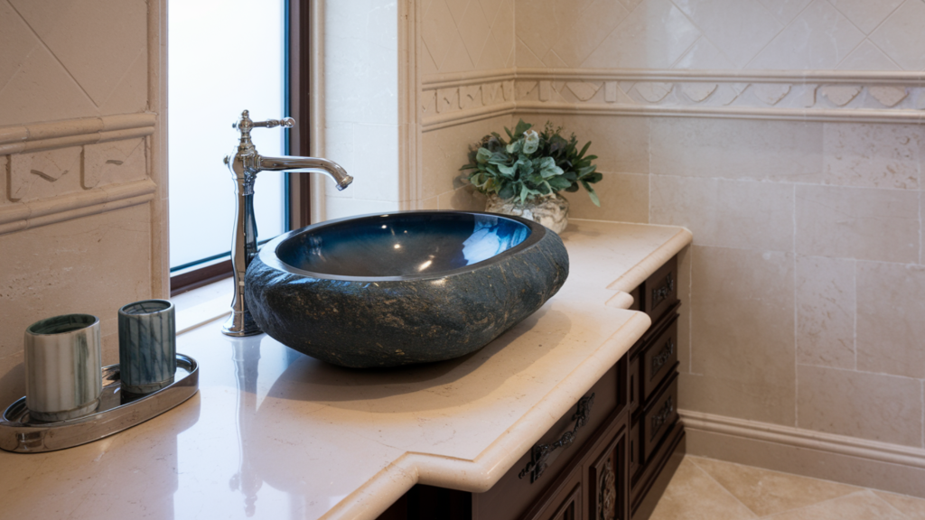 - Stone (Marble, Granite): Stone sinks are luxurious and timeless, offering a high-end aesthetic that is both classic and refined. They’re extremely durable, but they do require more care than ceramic or stainless steel. Stone sinks may need periodic sealing to protect the surface and prevent staining.