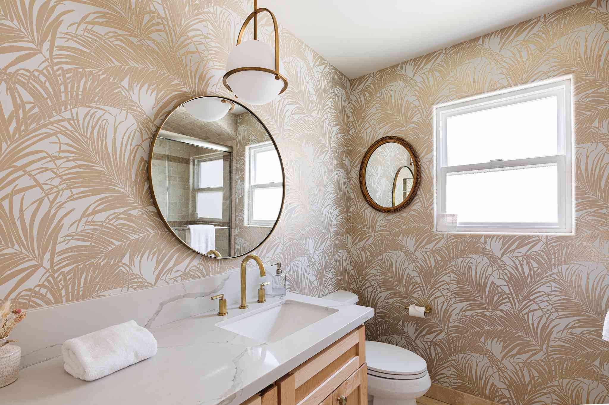 Metallics have seen a resurgence in popularity over the past few years—with gold-tone finishes leading the pack— and they show no signs of going away anytime soon. Bring opulence to your bathroom walls with wallpaper featuring shimmering metallic accents.