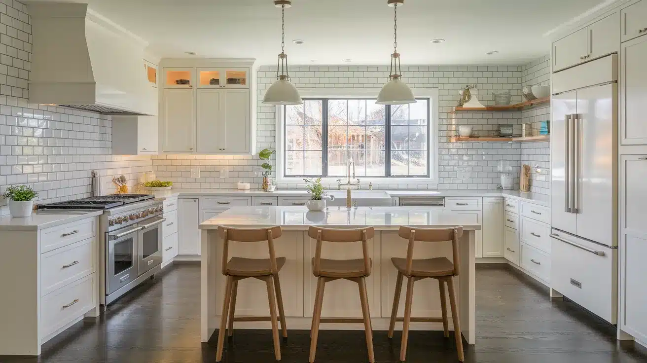 The backsplash features subtle patterns created by white subway tiles laid in a brick pattern.