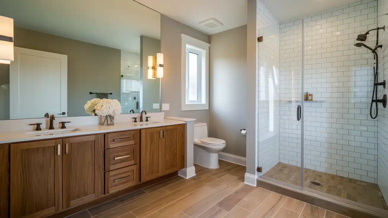 Simple white tiles in the shower keep the space bright, while wood-look floor tiles add warmth.