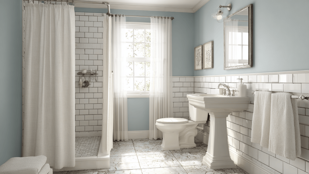 In bathrooms, this shade adds a soft, refreshing look. It plays well with white tile and brushed nickel, and it feels both clean and cozy. Small bathrooms benefit from the depth without the color feeling heavy.
