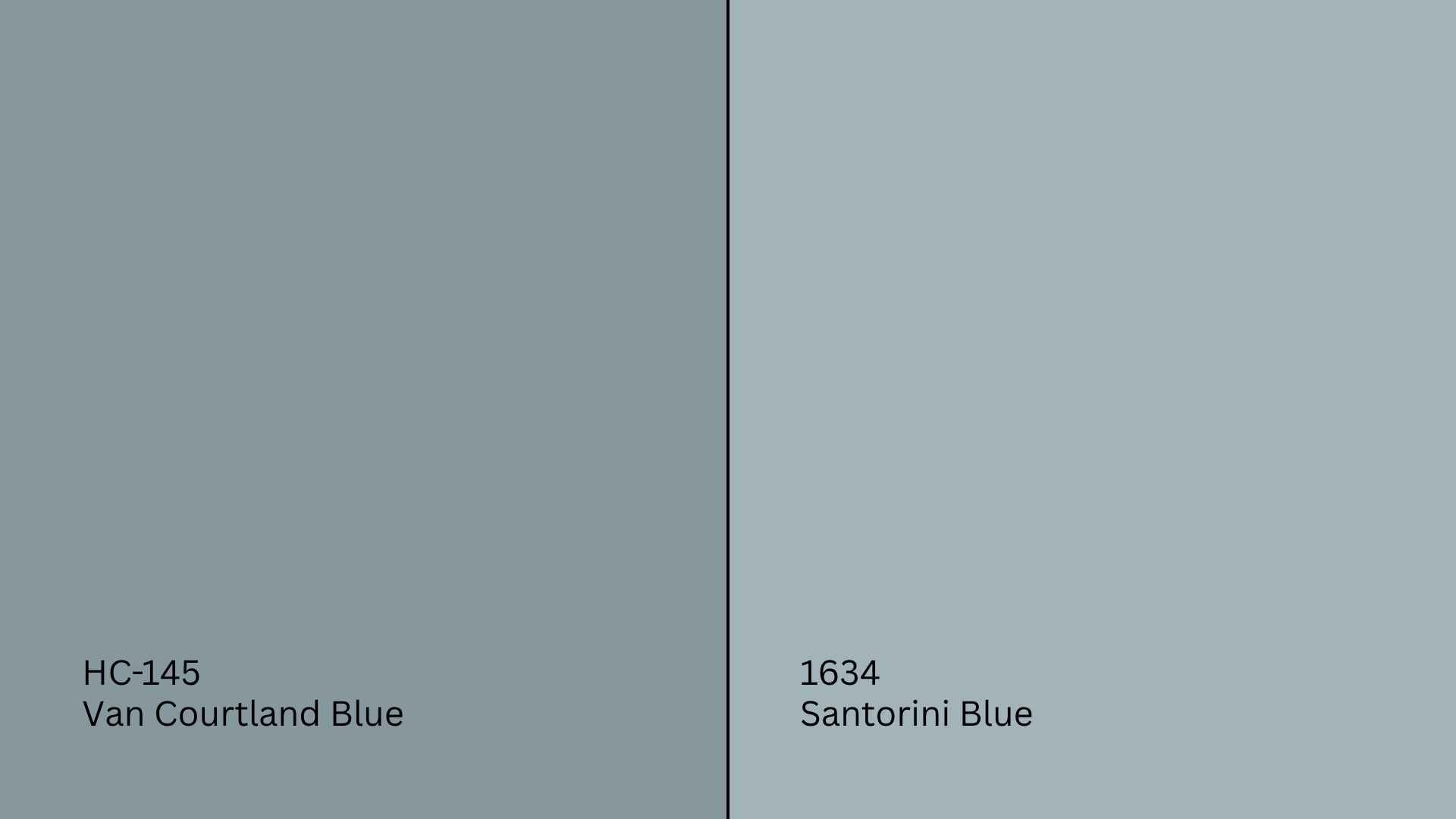 Santorini Blue (1634, #A2B5B8) is a lighter, brighter blue with cool undertones.