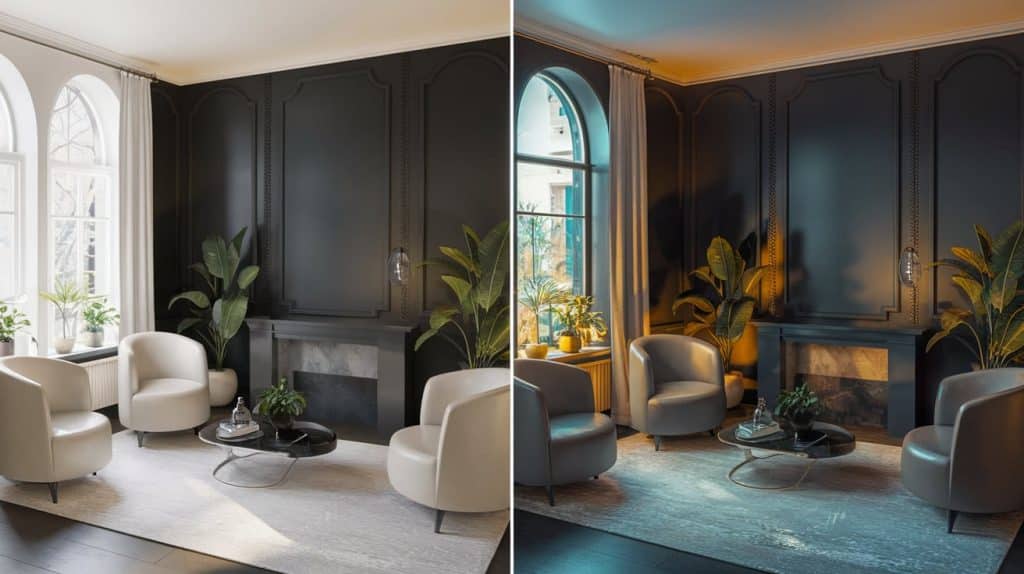 In north-facing rooms with cooler light, Wrought Iron can look darker, and its blue undertones might stand out more. The room might feel more dramatic.