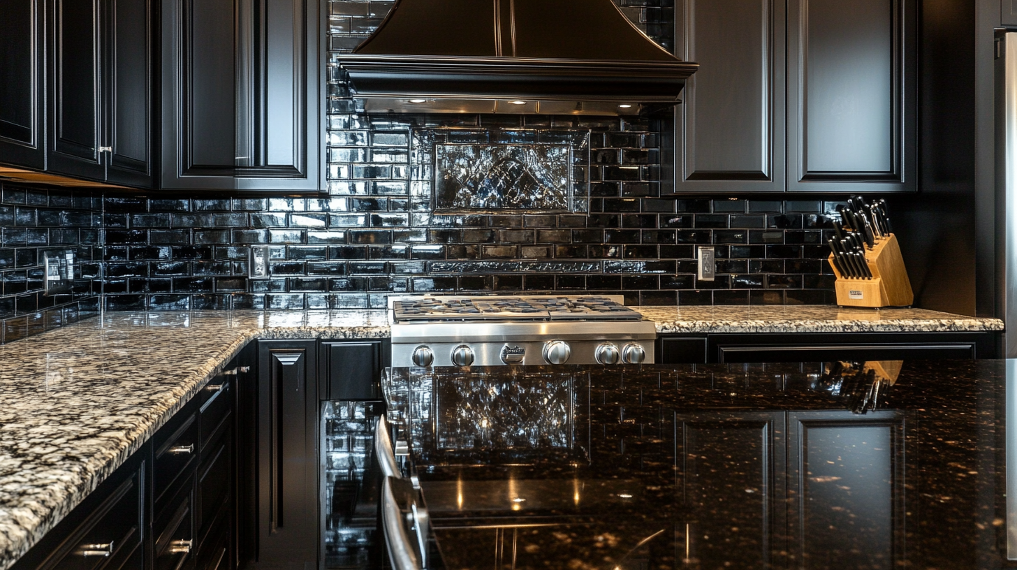 Black glossy tiles make a strong statement next to light granite. The shine reflects light and makes the kitchen feel alive. This bold choice works best in kitchens with good lighting.