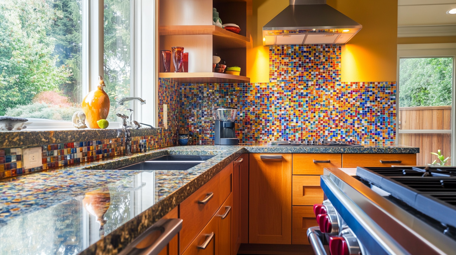 Mosaic tiles let you add many colors that pull from the specks in your granite. You can pick tiny glass, stone, or ceramic pieces to make a pattern that links to your countertops.