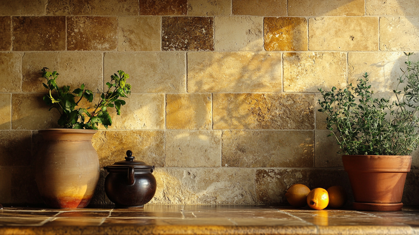 These natural stone tiles have tiny holes and a warm, soft color that feels cozy and rich. They work best with granite that has tan, cream, or gold tones.