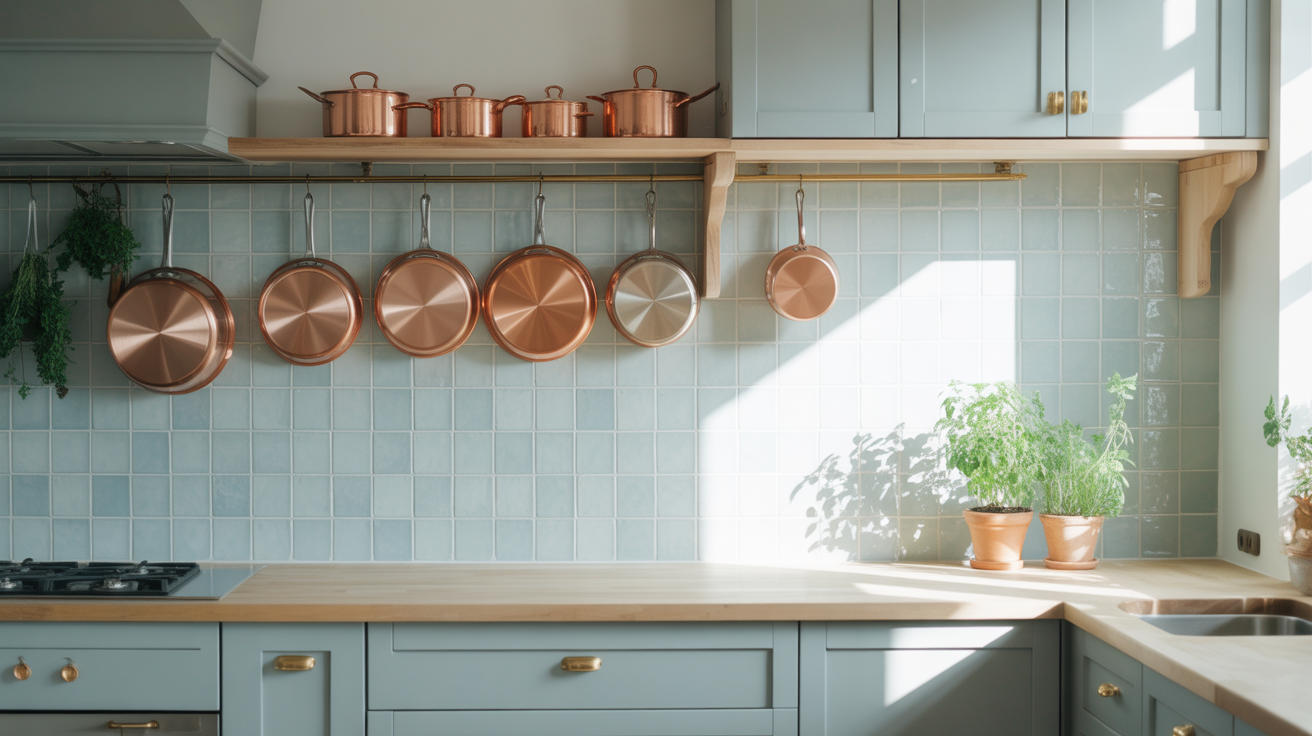 Pale blue tiles pair beautifully with gray cabinets, especially in coastal or airy kitchens. The soft color lifts the room’s tone without clashing.