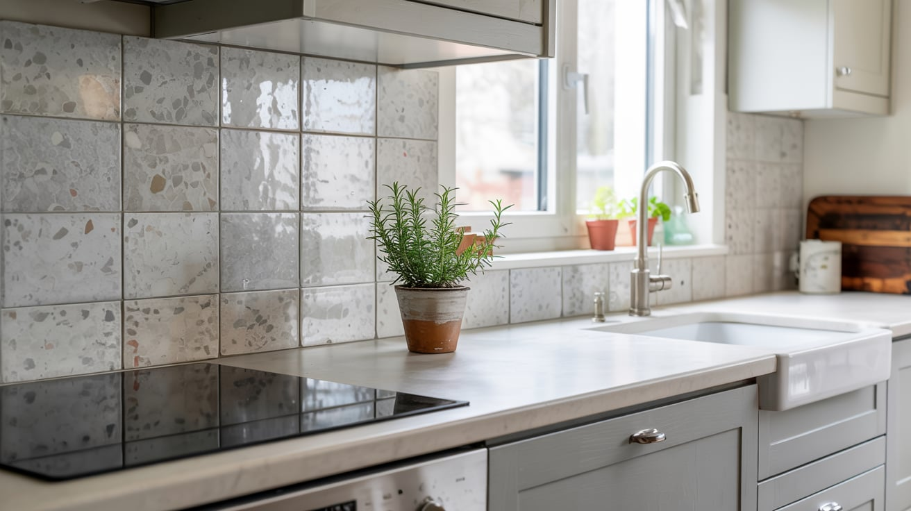 Terrazzo-style tiles add tiny specks of colour and break up large surfaces without being loud. When used behind gray cabinets, they introduce playful detail while still staying neutral.