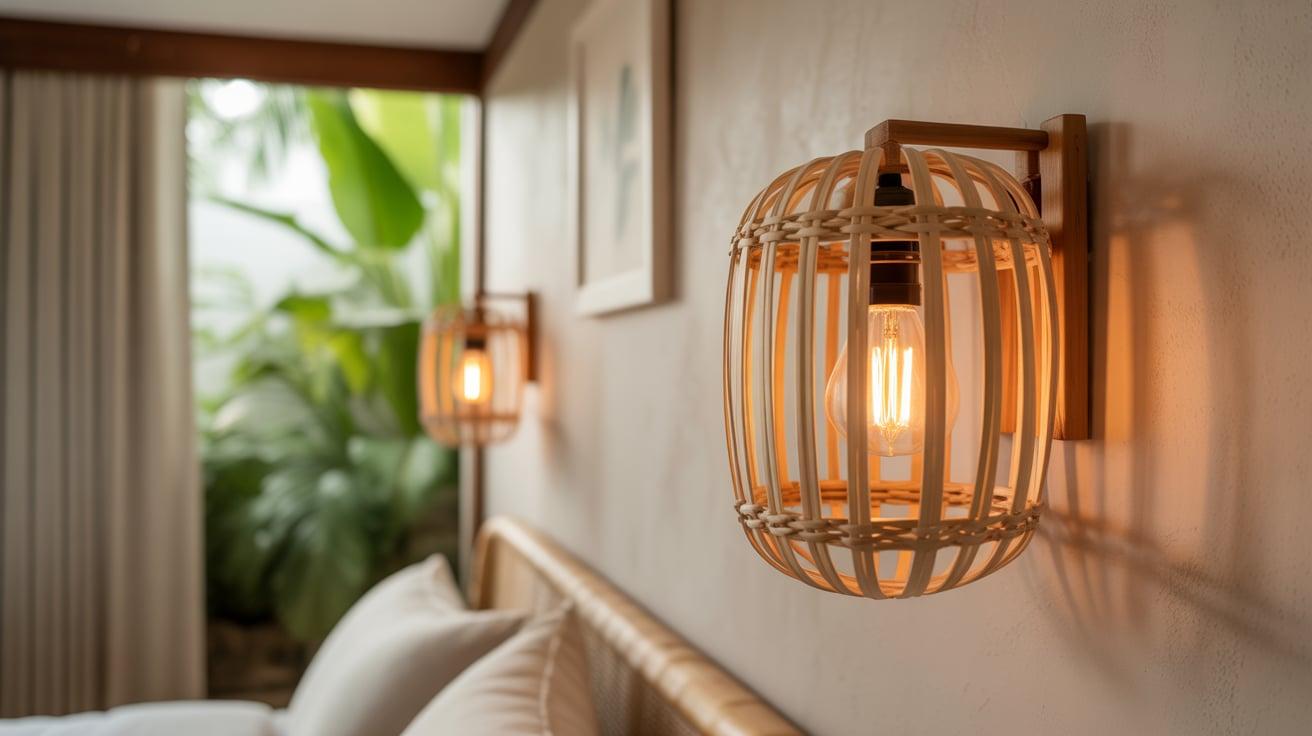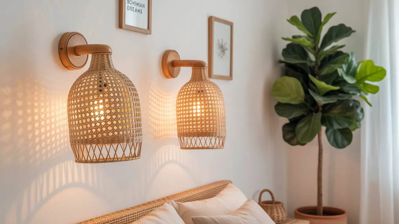These natural fiber sconces add texture and warmth to bedroom walls. Light shining through the woven pattern creates interesting shadows.