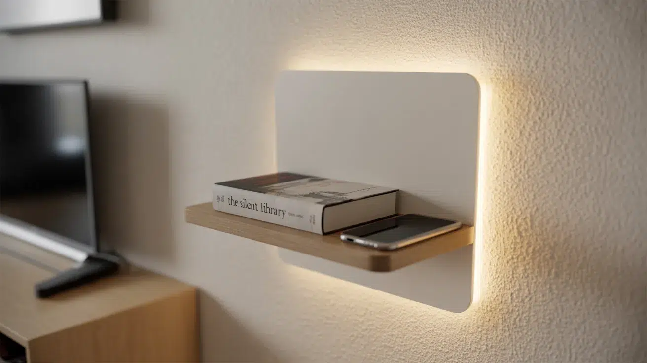 These clever designs include a small wooden platform below the light fixture. The shelf provides space for a phone, a small book, or a glass of water.