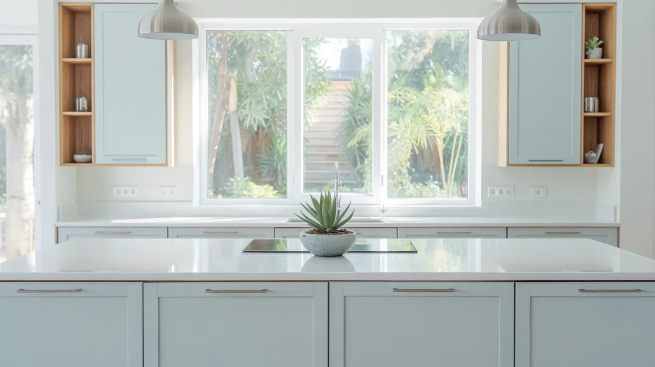 Mount Saint Anne is a light blue-gray that feels clean and crisp. It makes the kitchen feel open and calm, without feeling too cold.