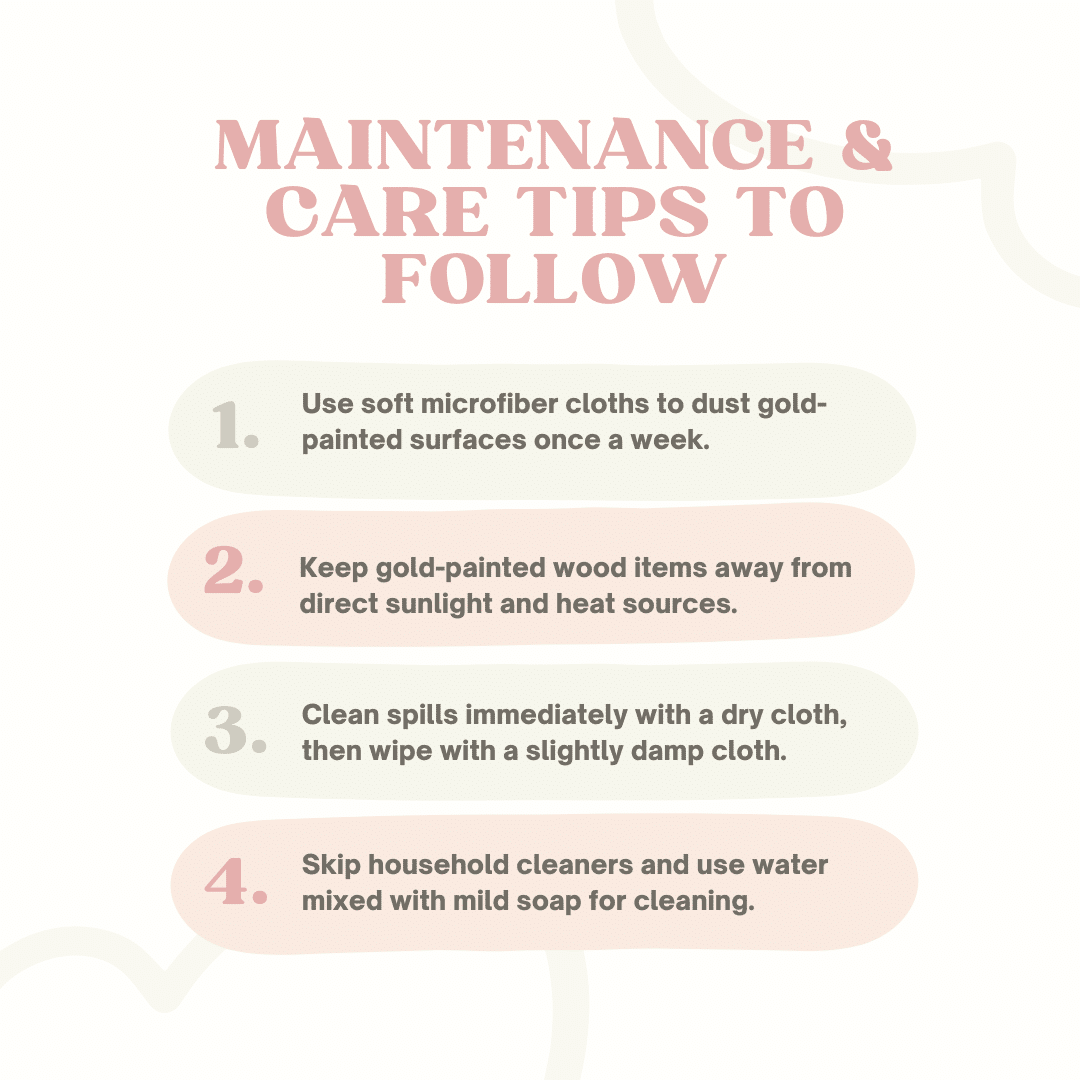 Taking care of sealed gold paint isn’t hard, but it needs attention. I dust with a soft cloth and clean up spills right away. Water sitting on the surface can hurt the finish, so I use coasters.