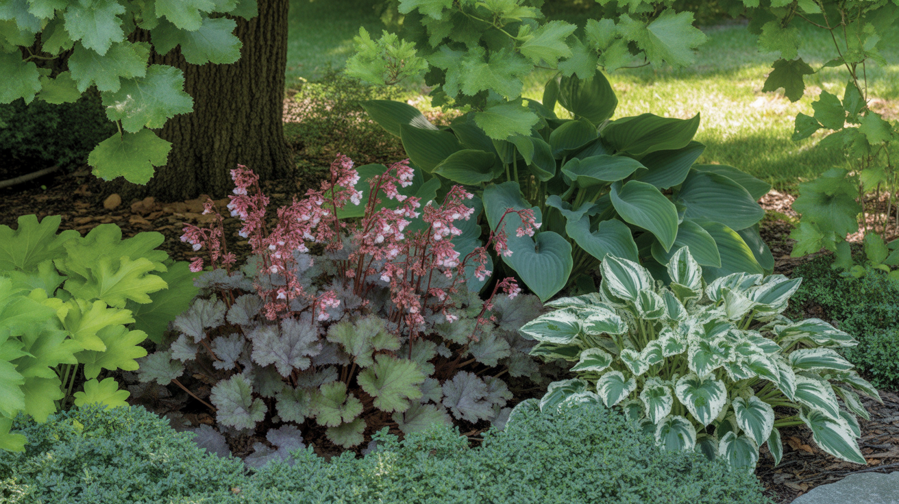 | Coral Bells | Bright shades of purple, peach, lime; ruffled leaves | Partial shade | 12–18 inches apart | Adds color to shady spots; delicate flower spikes |
