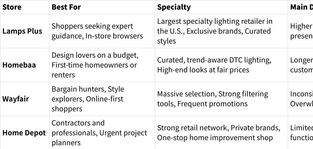 Compared to Wayfair or Lamps Plus, it has fewer SKUs of lamps and a more limited selection.