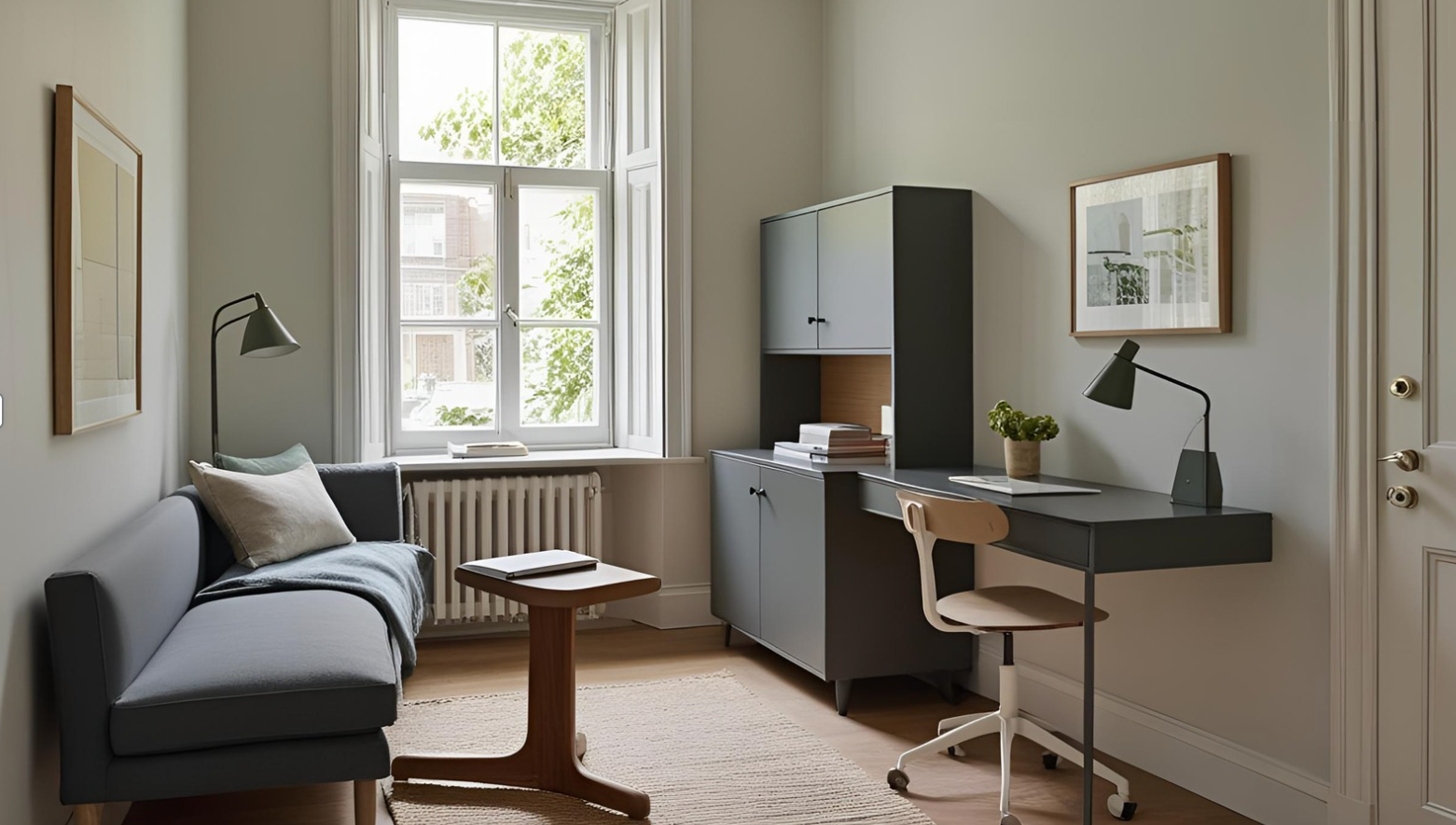 A small desk, positioned near a window or tucked into a back corner, creates a quiet work zone. A short shelf or slim cabinet helps define the space without making it feel cramped.