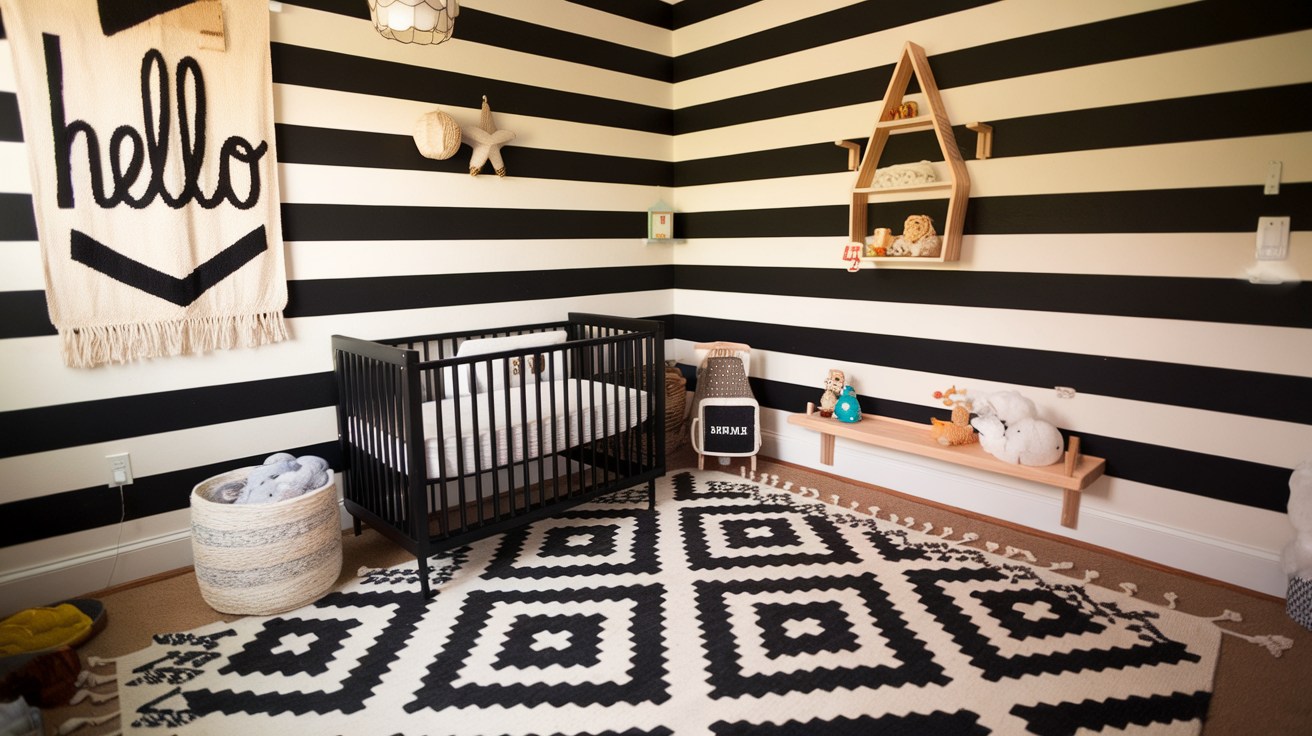 Black and white nurseries are great for babies. They help the baby’s vision develop. You can add textures, plants, or pops of color, pick patterns like dots or stripes, and use rugs and wall art.