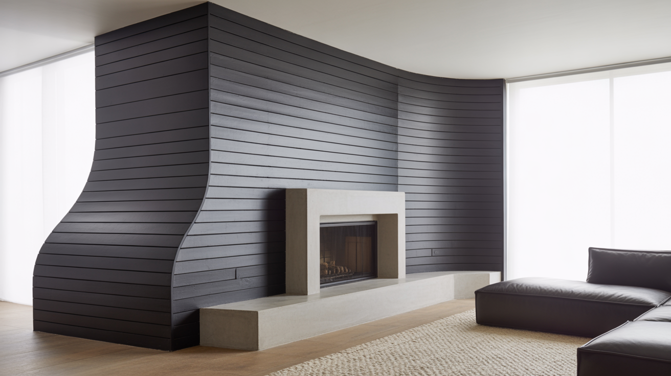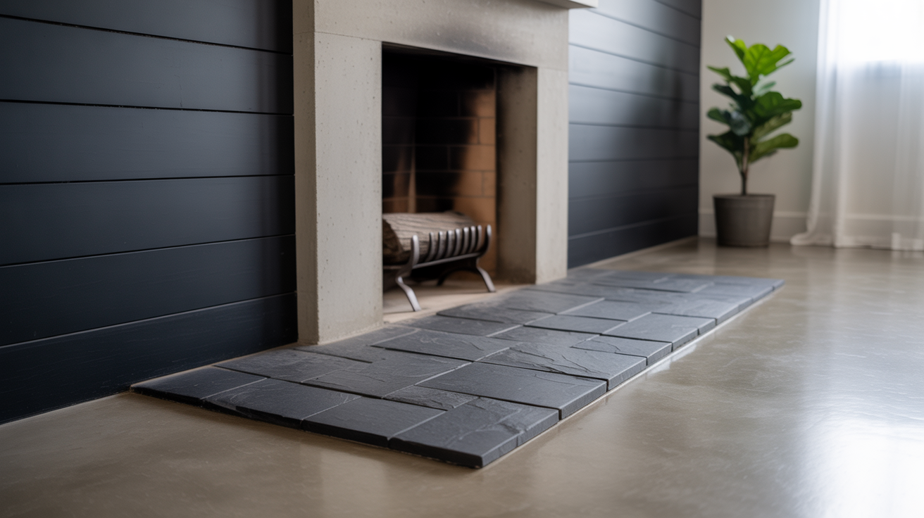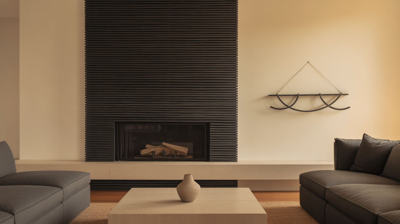 Practical, fire-resistant materials create safety zones that double as design features. The textural contrast between smooth tile and lined wood adds visual interest while serving essential functional requirements.