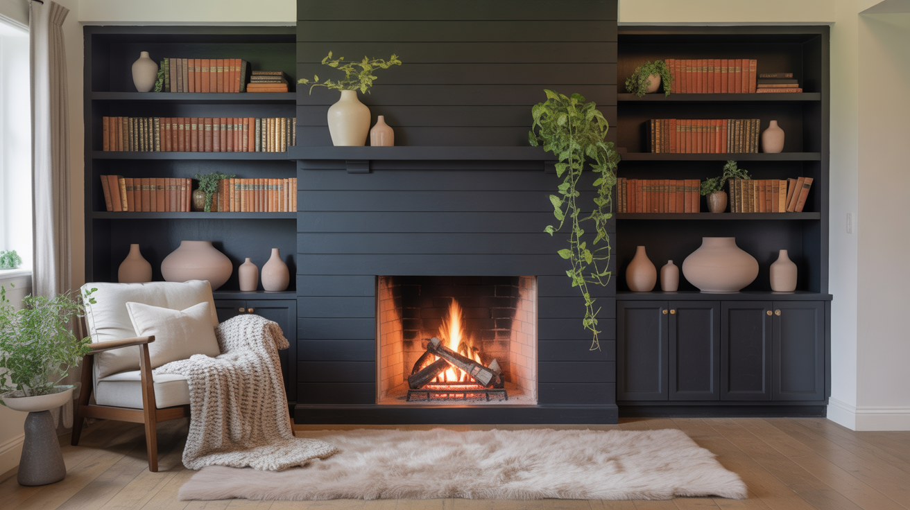Flanking shelves in matching dark finishes extend the fireplace’s visual footprint across the wall. This creates a cohesive built-in look while providing practical display space for books, artwork, and decorative objects.