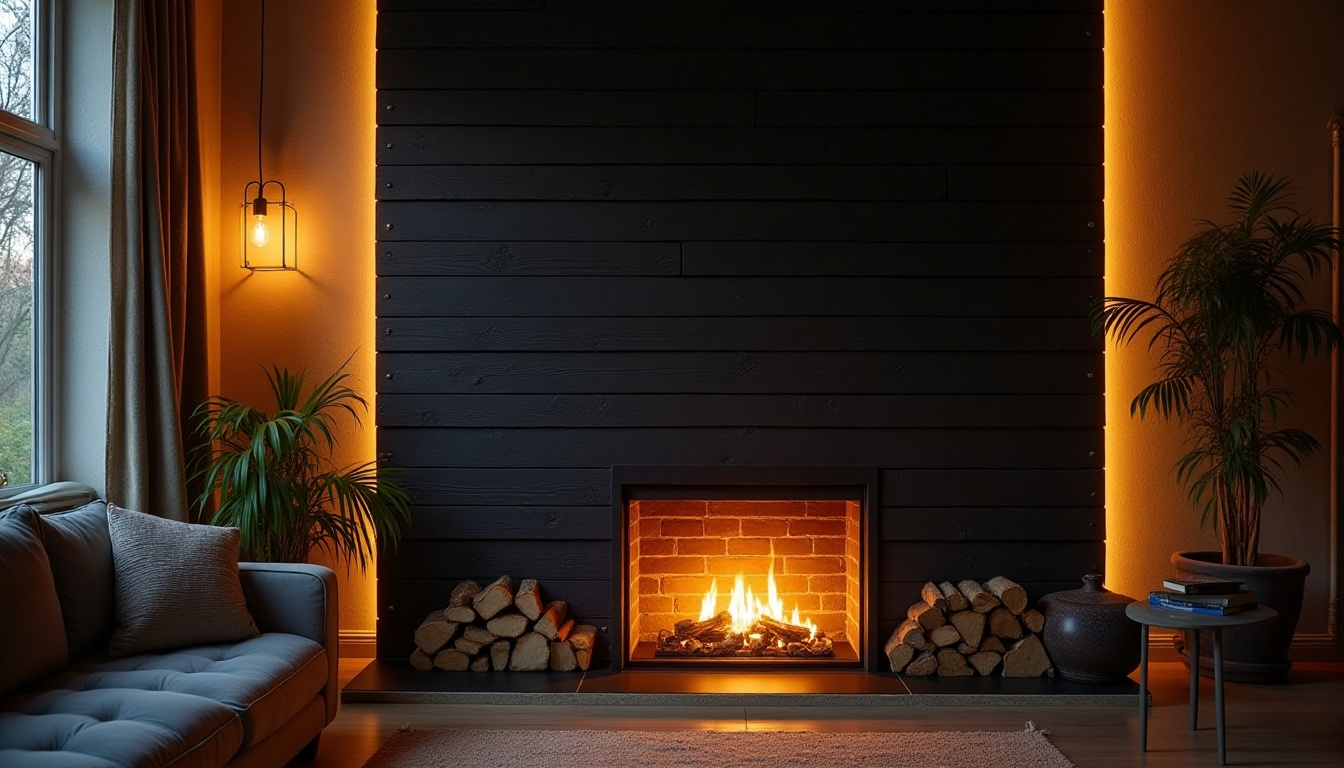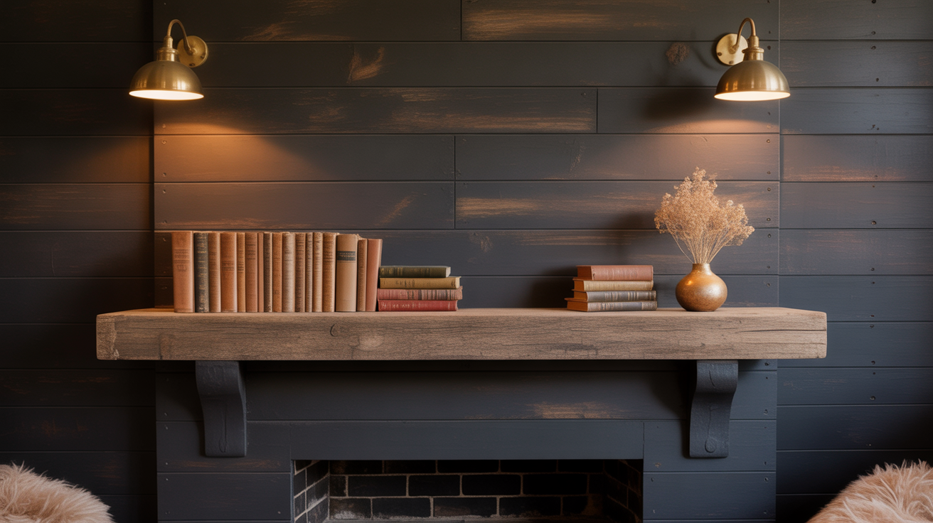 Wall-mounted lighting creates dramatic shadows across textured black surfaces. Proper placement illuminates mantel displays while highlighting the dimensional quality of shiplap’s linear grooves through side-casting light.