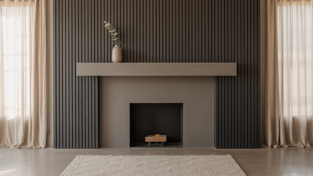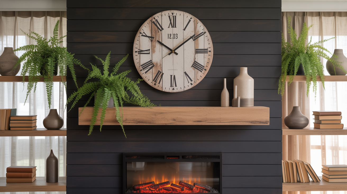 Pair vertical black paneling with a chunky wood mantel and a large rustic clock. This combo blends modern lines with cozy charm—perfect for farmhouse or transitional living spaces.