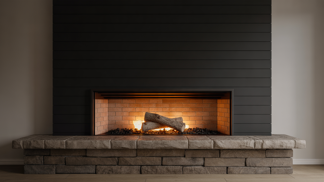 A stone hearth or surround introduces textural contrast and material diversity. This mixed-media approach adds visual weight to the base while letting the sleek black shiplap draw the eye upward.
