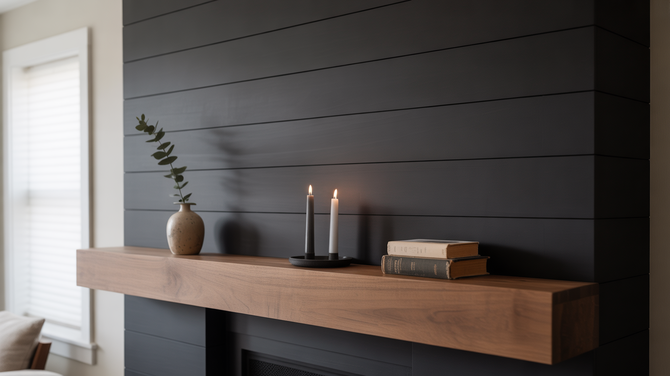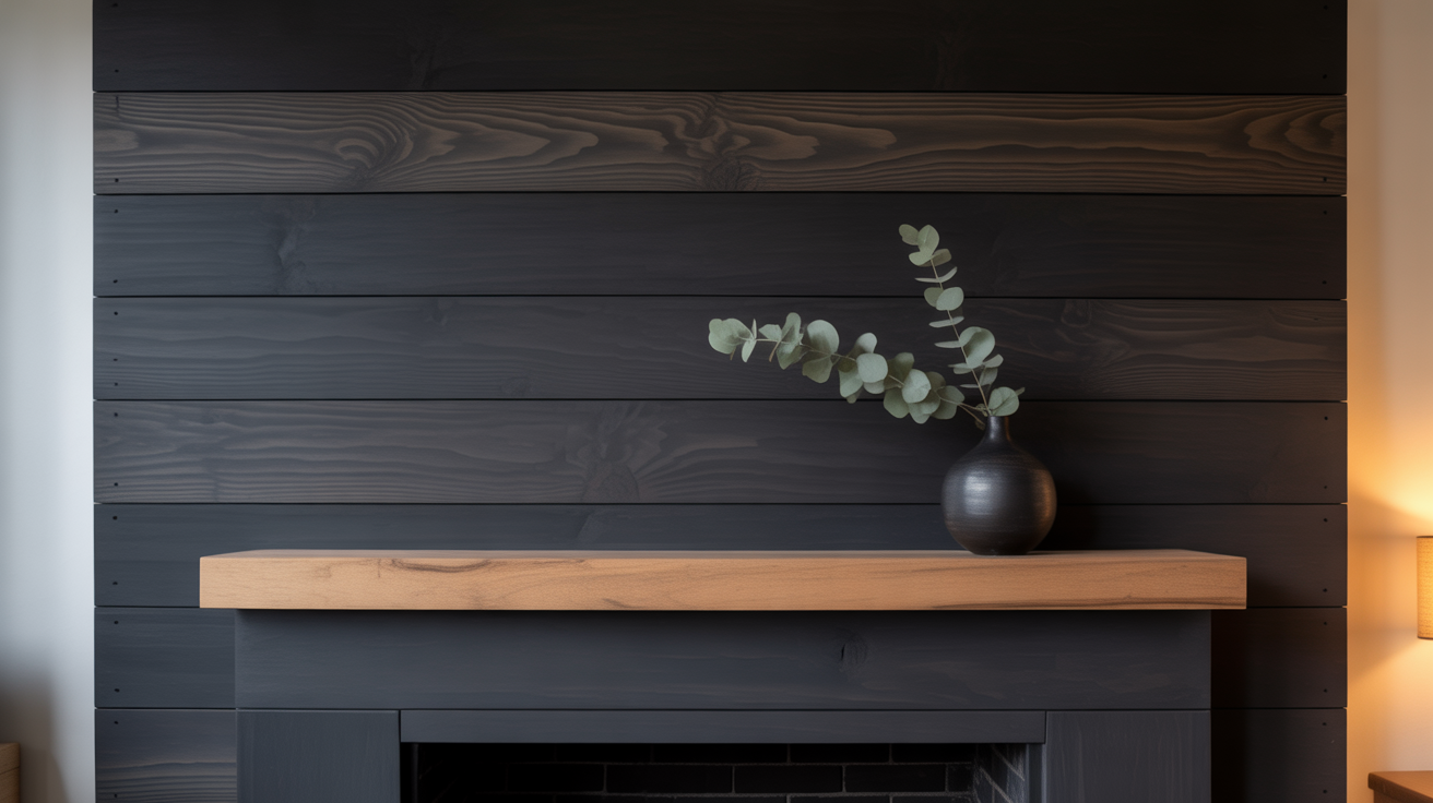 This classic contrast pairs deep black boards with a substantial natural wood mantel. The warm wood element softens the bold backdrop while providing practical display space and grounding the overall composition with organic texture.