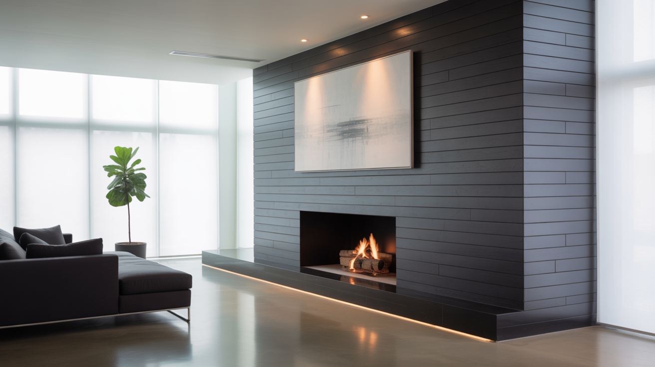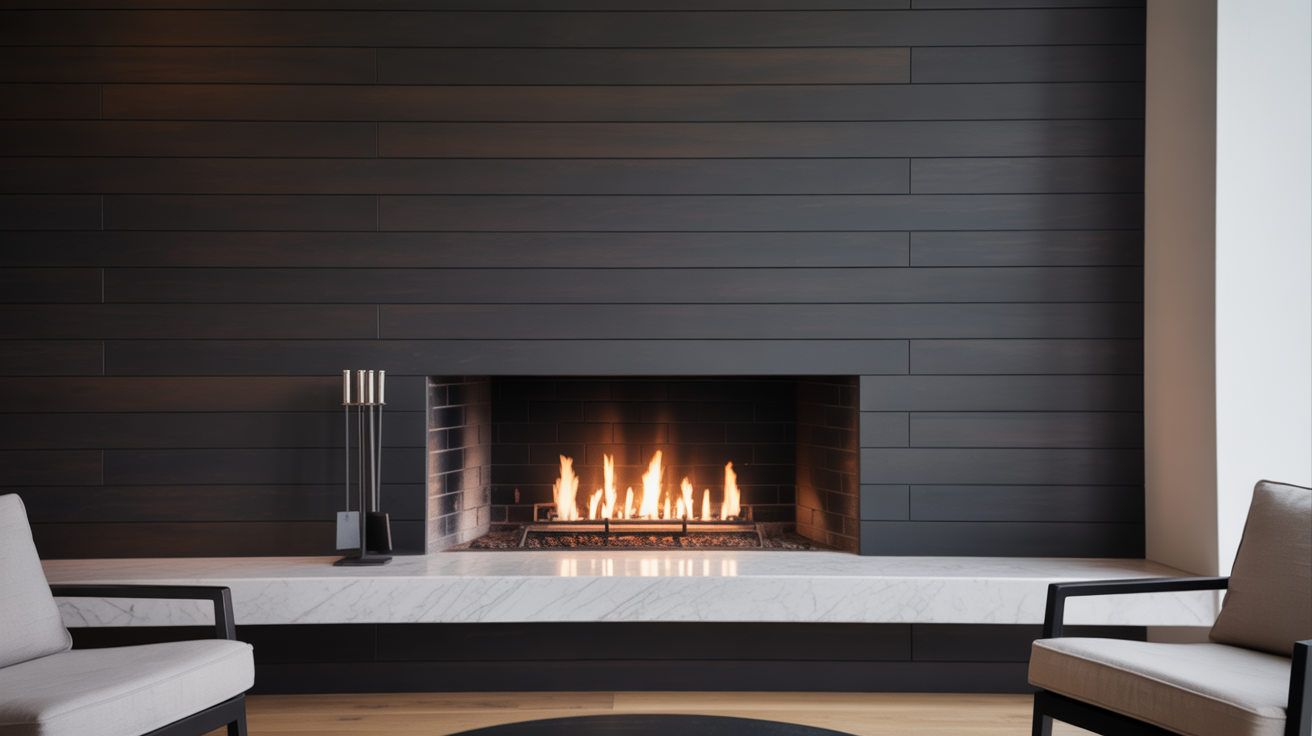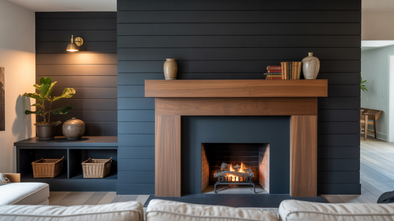 Industrial touches complement the bold simplicity of dark shiplap. Metal mantels in blackened steel or iron add substantial presence while maintaining the monochromatic palette for maximum dramatic impact.
