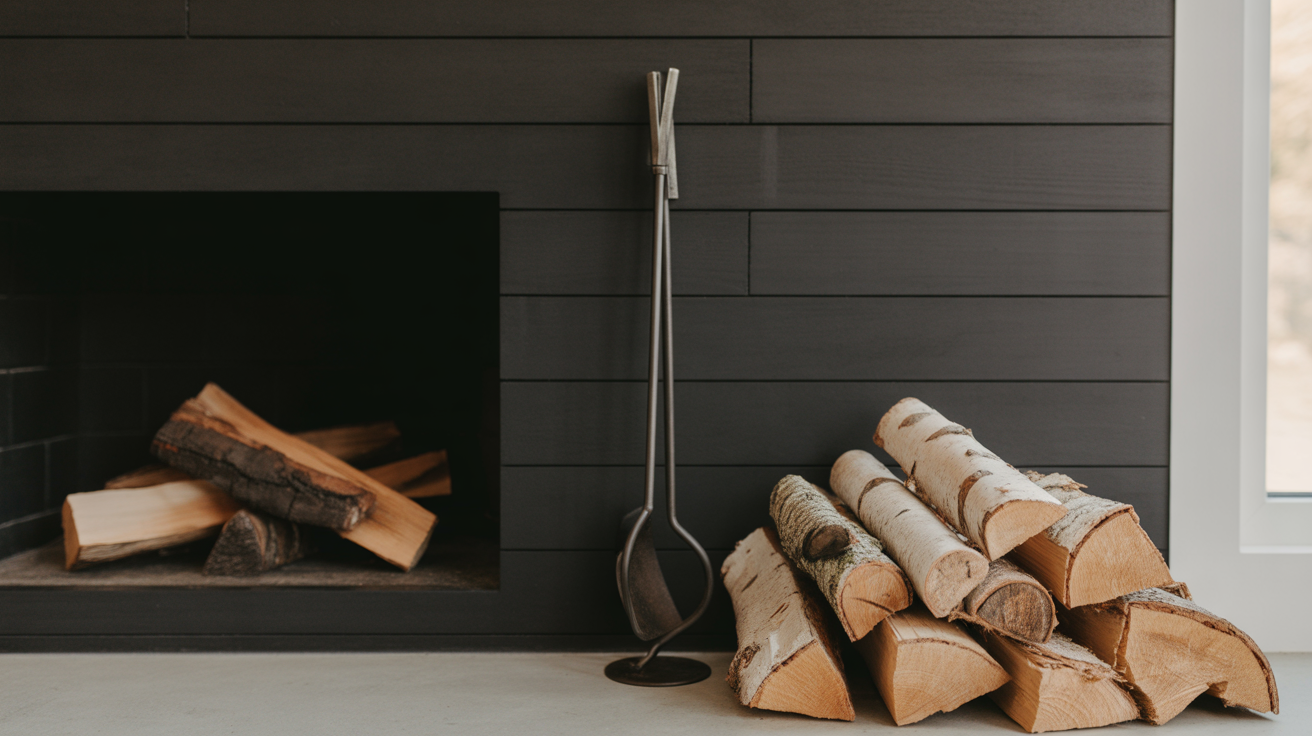 Firewood storage becomes an intentional design element against dark backgrounds. The organic texture and varied tones of natural logs create a beautiful contrast with the consistent black surface behind them.