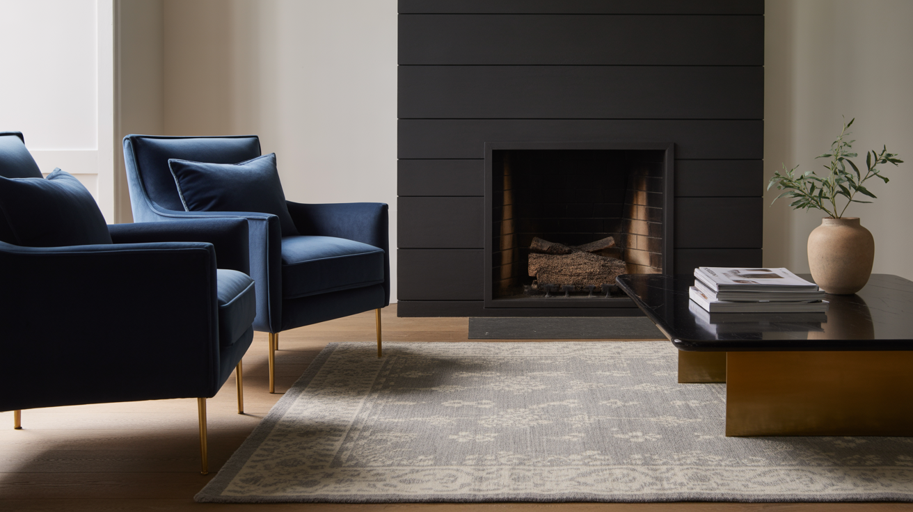 Add cozy touches like navy furniture, soft rugs, and plants to make the room feel warm and pulled together.