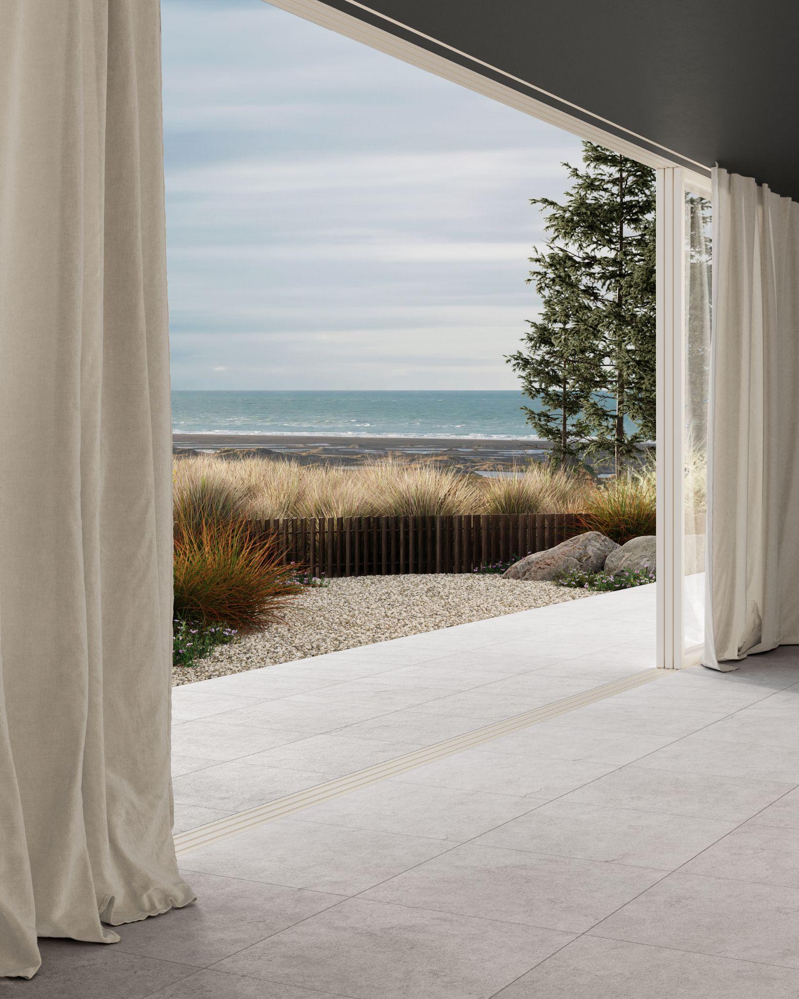 A continuous tile surface works best when it has something to play against. For example, raw timber furniture on a smooth stone-look floor or linen curtains falling beside a concrete-toned wall tile.