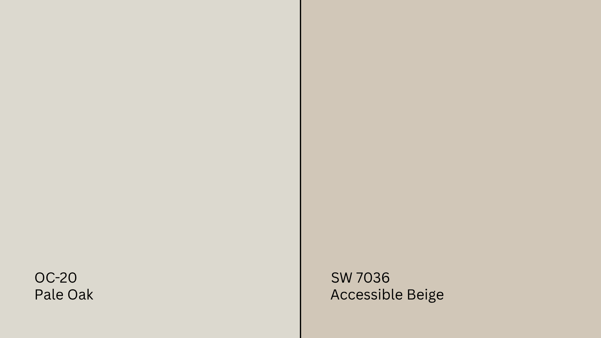 Accessible Beige (SW 7036, #D1C7B8) feels cozy in larger spaces but lacks Pale Oak’s airy softness.