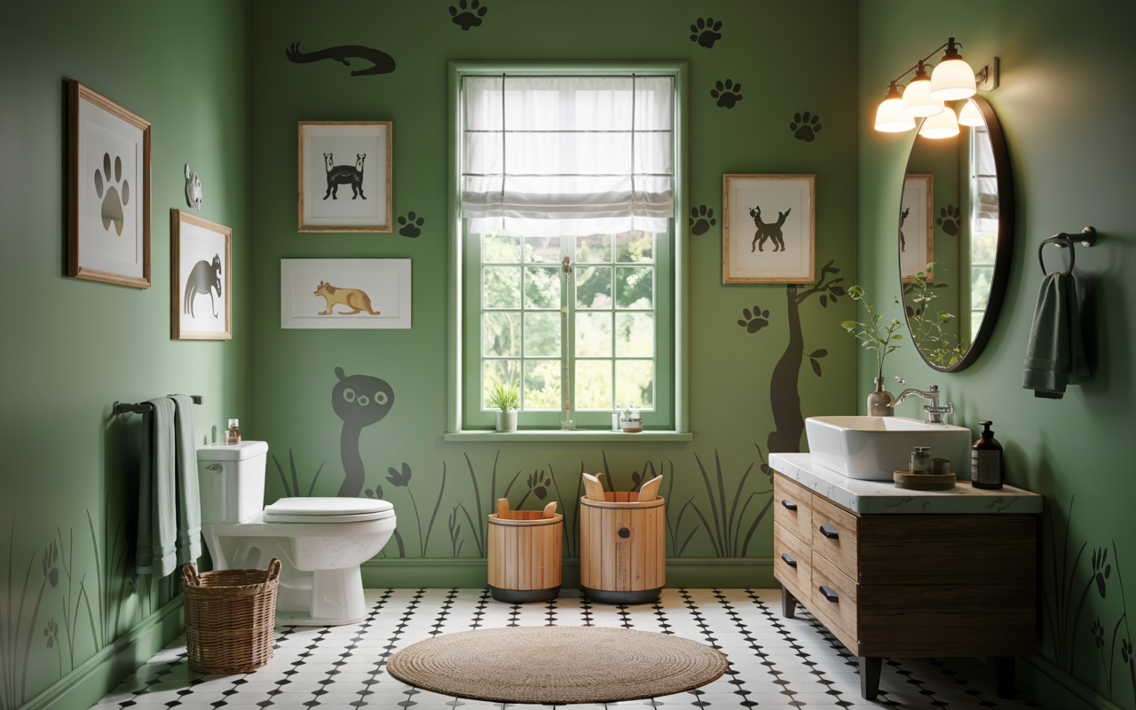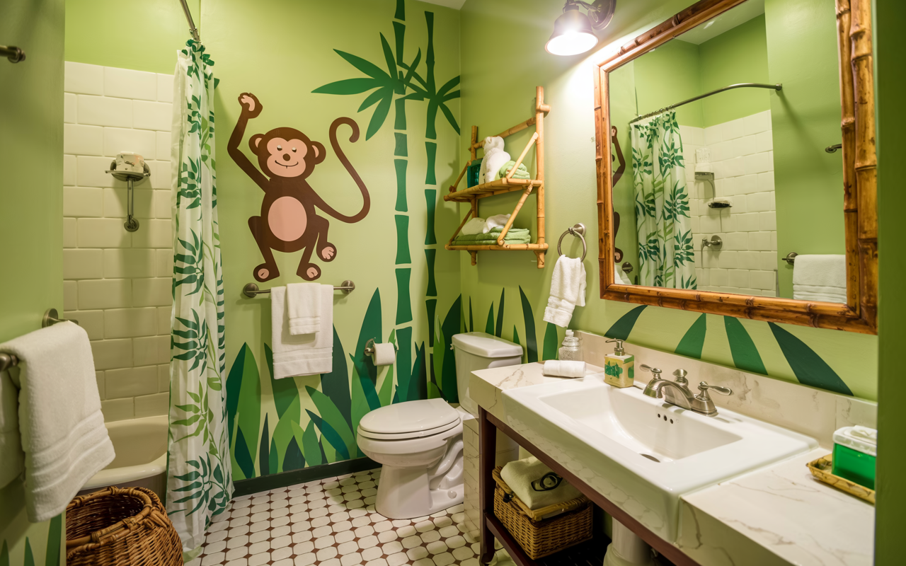 Go for earthy tones like tan and green. Add animal decals like elephants or monkeys. Use bamboo-style storage and leafy prints for the shower curtain.