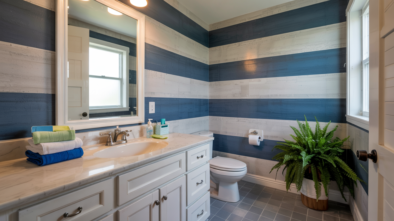 Paint wide stripes on one wall using two colors. Blue and gray or red and white are easy combos. Add neutral towels and rugs to match.