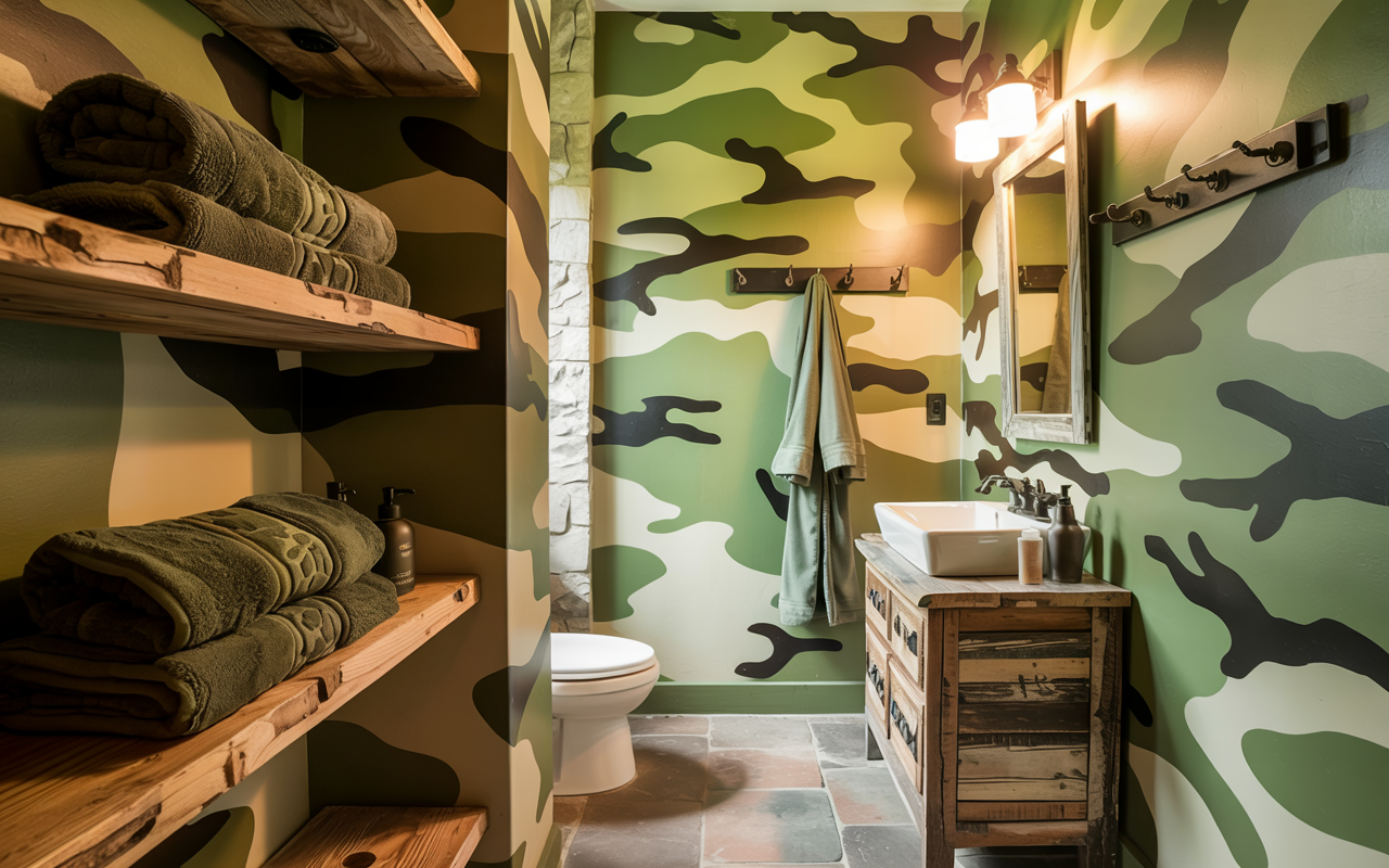 Go for olive green, brown, and dark gray to get a camo look. Use towels and shower curtains that match the colors.