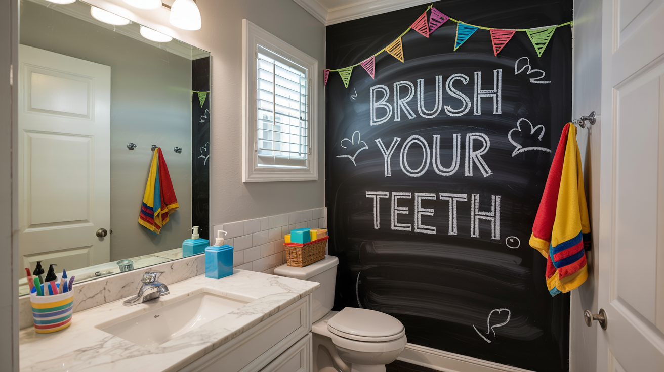 The rest of the bathroom can stay plain or simple to balance things out. This adds a fun personal touch that changes often and helps kids get involved.