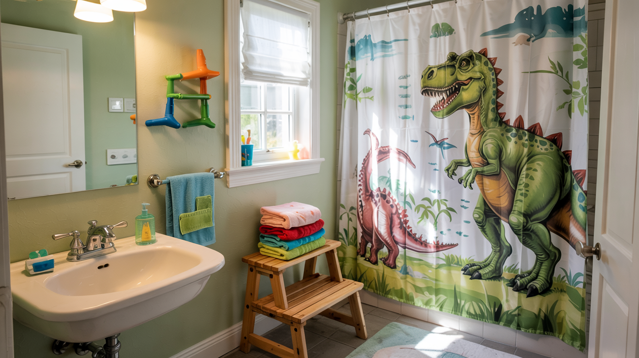 Use towel hooks shaped like dinosaur heads or footprints, and add themed toothbrush holders or rugs. Stick to soft green and brown tones to bring out the Jurassic look without making it too busy.