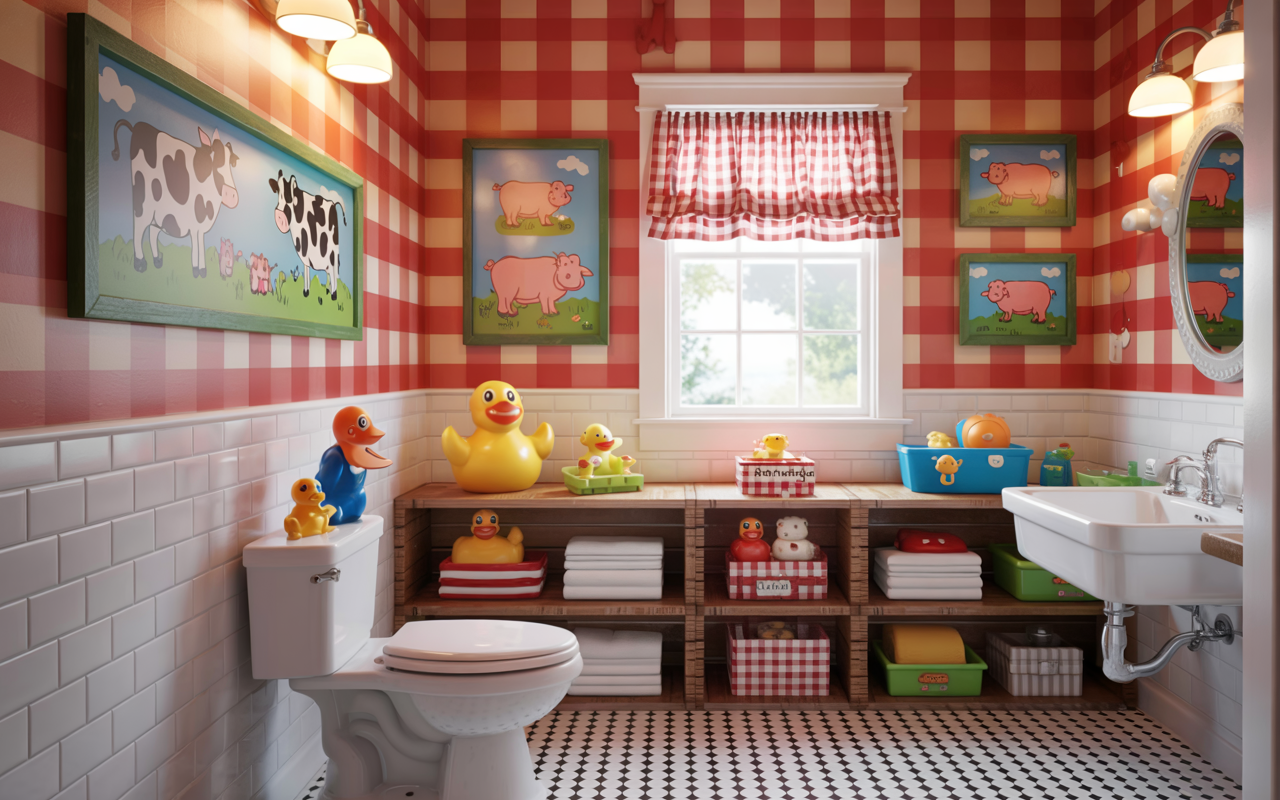 Store supplies in wooden crates or wire baskets. Use rugs shaped like animals or hay bales. A shower curtain with barns or tractors adds a fun touch.