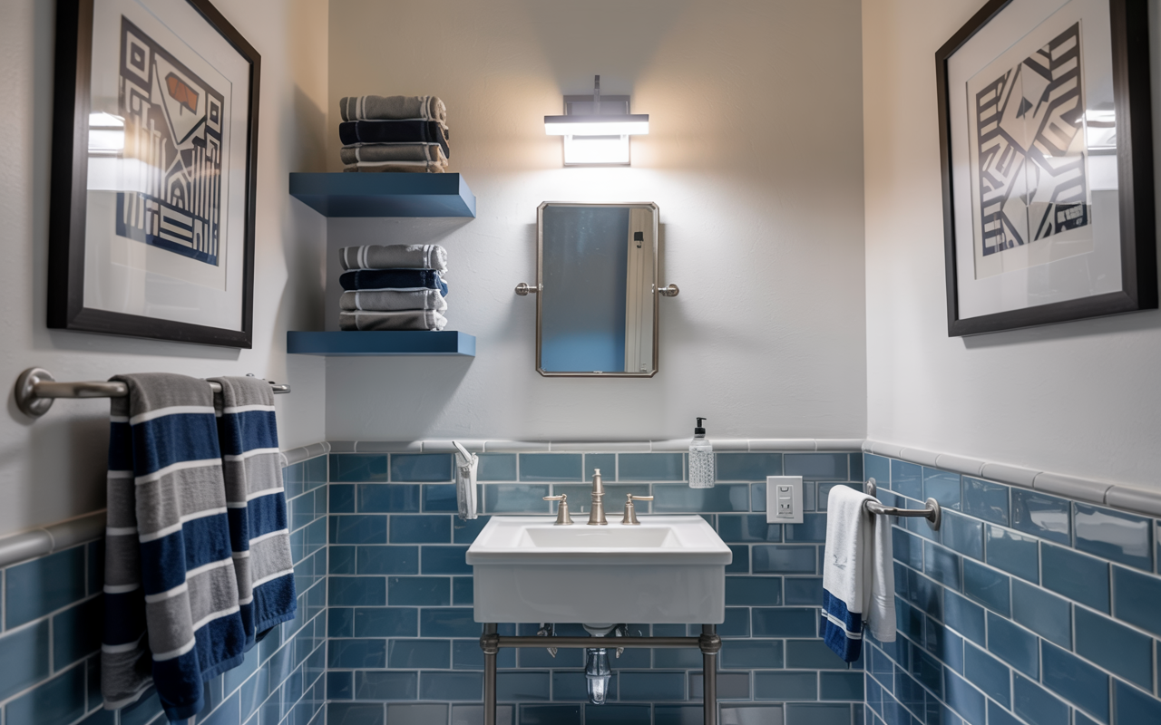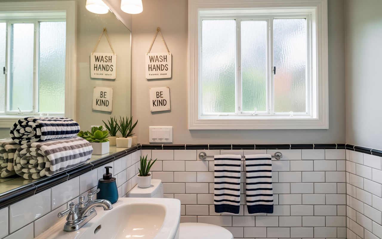 For a neat, balanced look, use soft gray on the walls and navy towels or bins. Add framed signs with short messages or name labels.