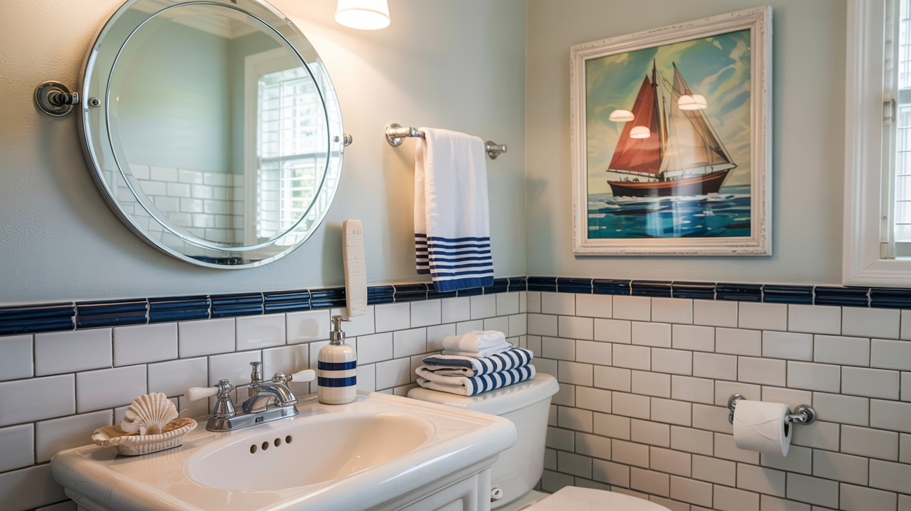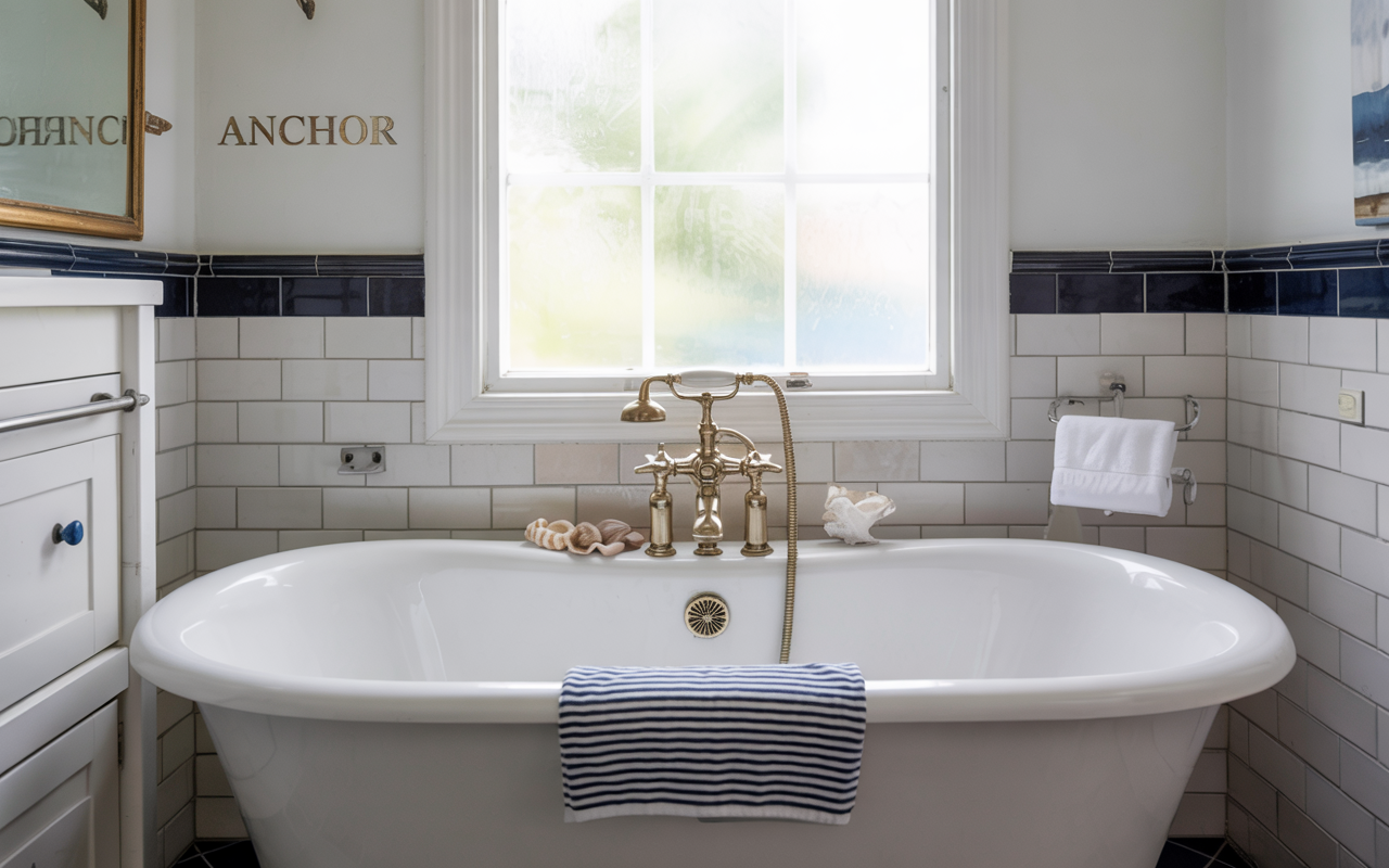 A navy and white colour scheme creates a clean and bold base that works well for all ages. Simple touches like lifebuoy mirrors, rope-style towel hooks, and anchor-printed shower curtains can be added.