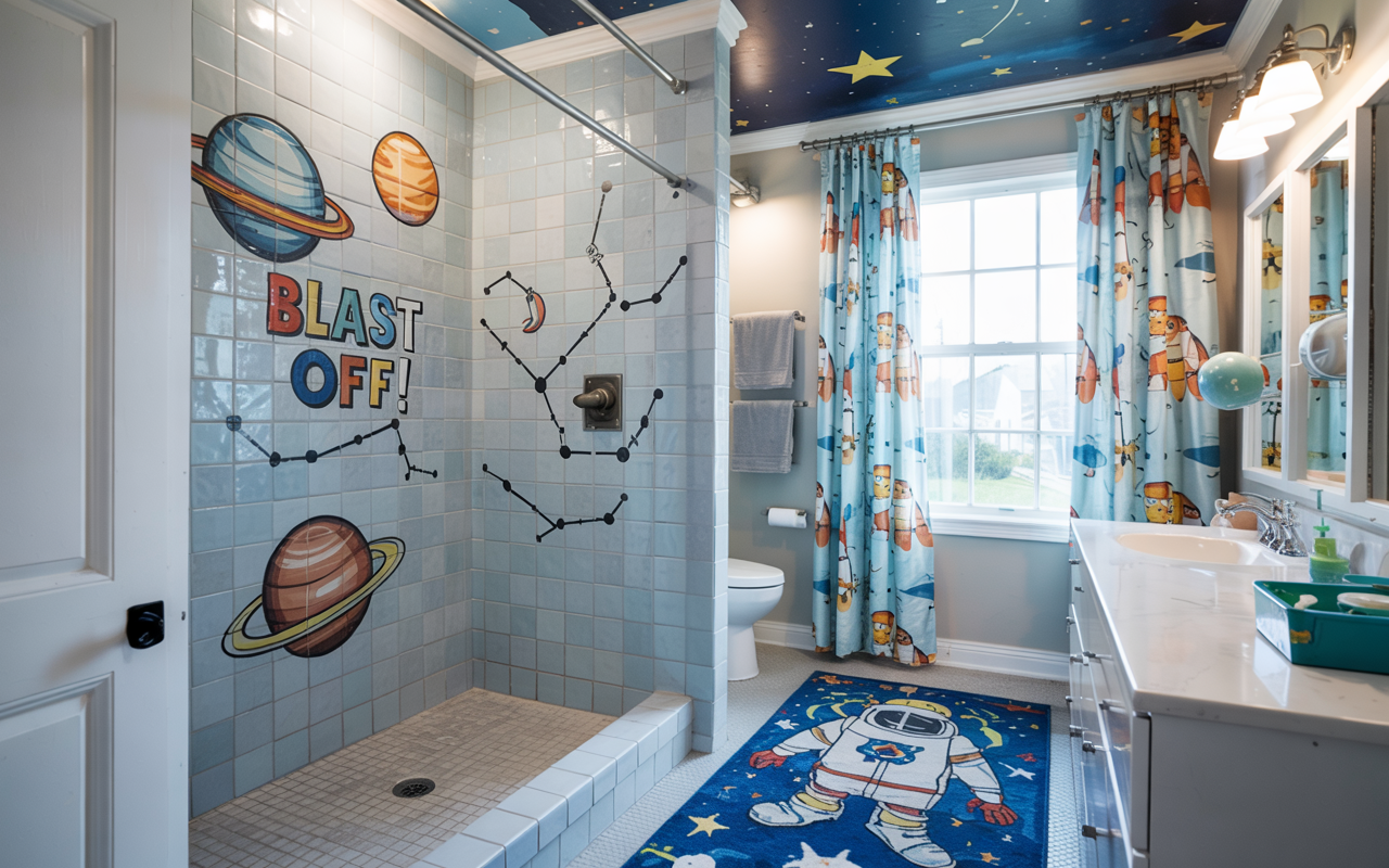 Use silver bins for storage and hang a space chart above the toilet. For extra fun, add a rug with stars or an astronaut.