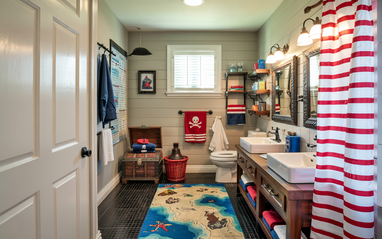 Add wall hooks shaped like swords or anchors, and include a map rug or parrot-print mat. Hang a skull mirror or compass sign to round out the space.