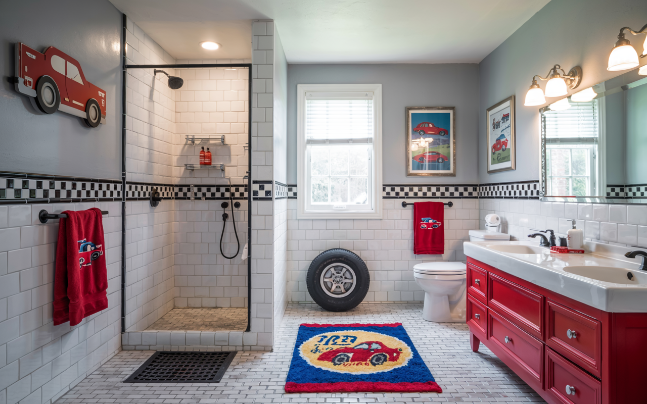 Add decals of racecars or pit stops near the sink. Hang a shelf shaped like a track or label drawers with car numbers.